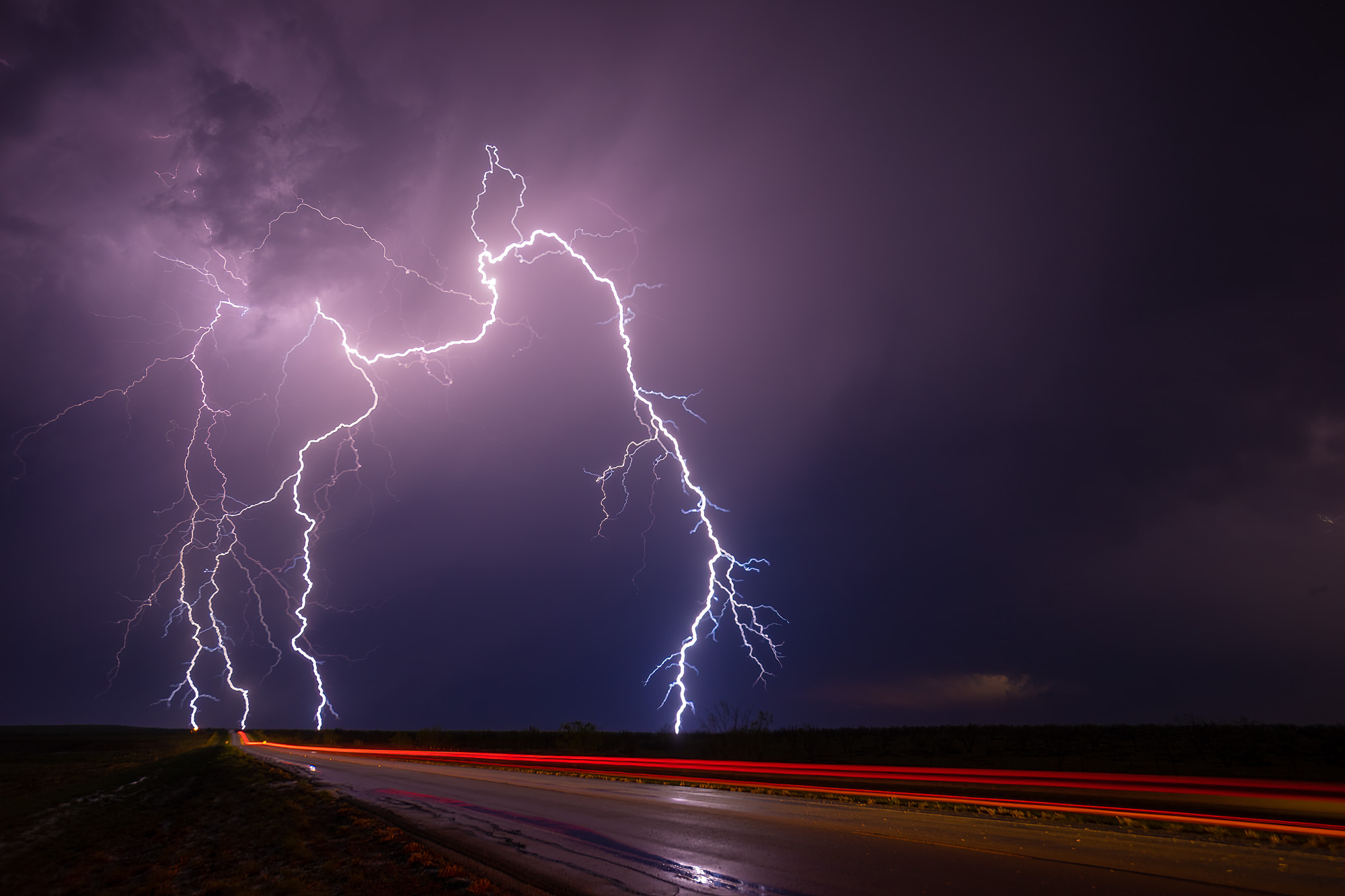 The road we were parked on led straight towards where the lighting was striking, so I pointed my camera down the road, hoping to time a car driving down the road at the same time lightning struck. I would wait for a car to drive down the road, hit the shutter button, and just hope for a lighting strike.