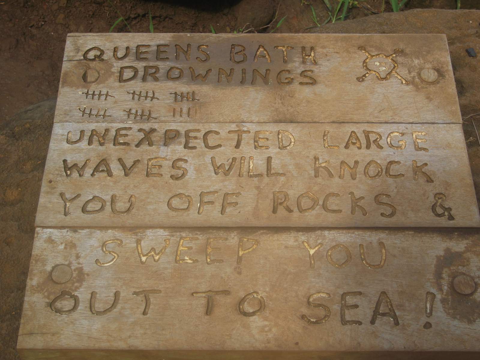 The north shore of Kauai can be treacherous any time of year, but especially between October and May. As you walk down the path toward Queen's Bath in Princeville (a natural tide pool carved into the lava rocks), you'll see a sign on the ground with tally marks carved into it. Those tally marks indicate the current number of deaths at that location; at that time, it was approaching thirty. Is the body count real, or is it just a way to scare a certain percentage of tourists away? Who knows, but I always pause at the sign and take 5-10 minutes to observe the waves before stepping onto the rocks, even after checking the surf reports.