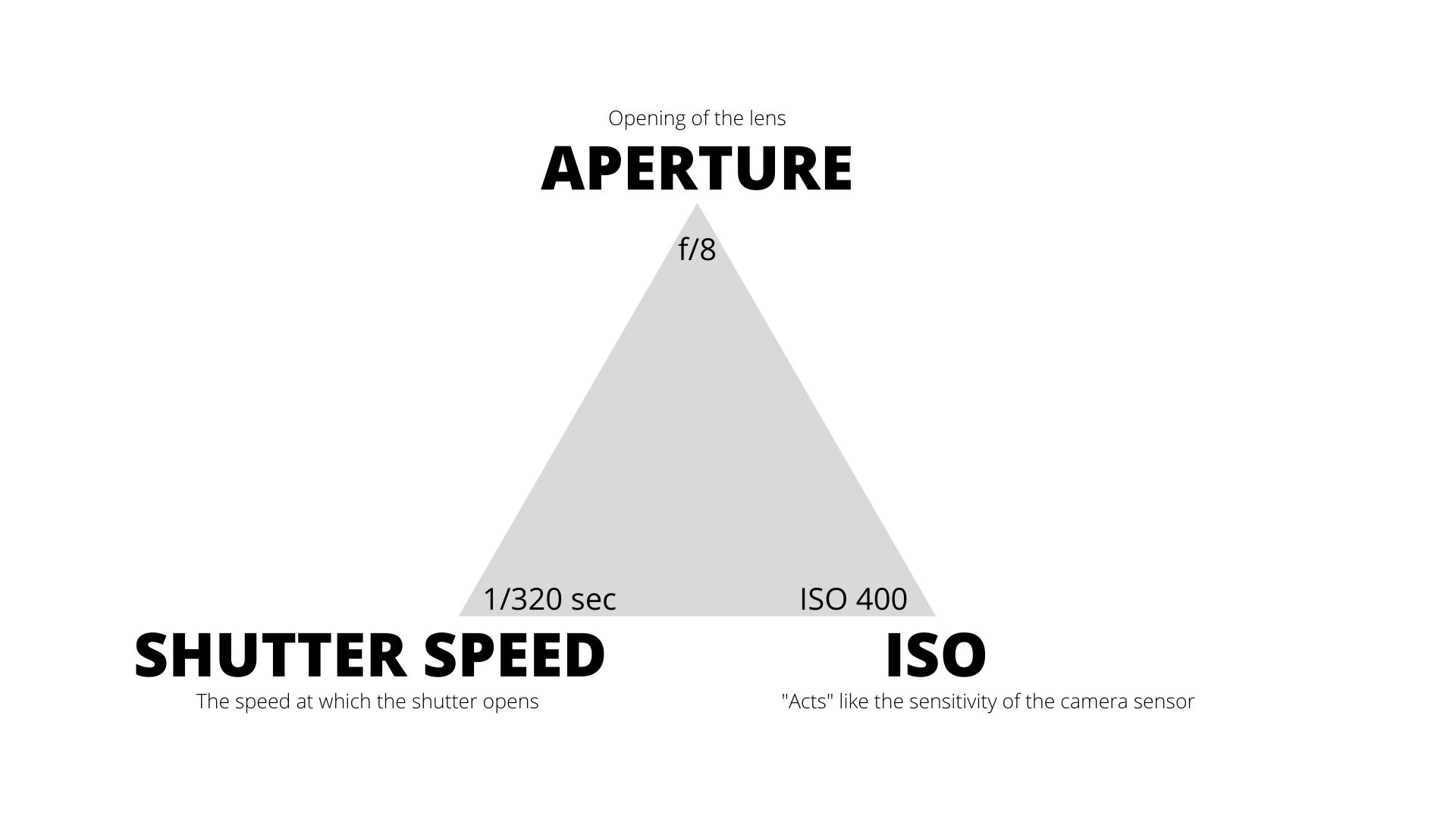 In photography, we have 3 different elements which make up an exposure that need to work together, namely aperture, shutter speed, and ISO. See the diagram below which shows these 3 elements.