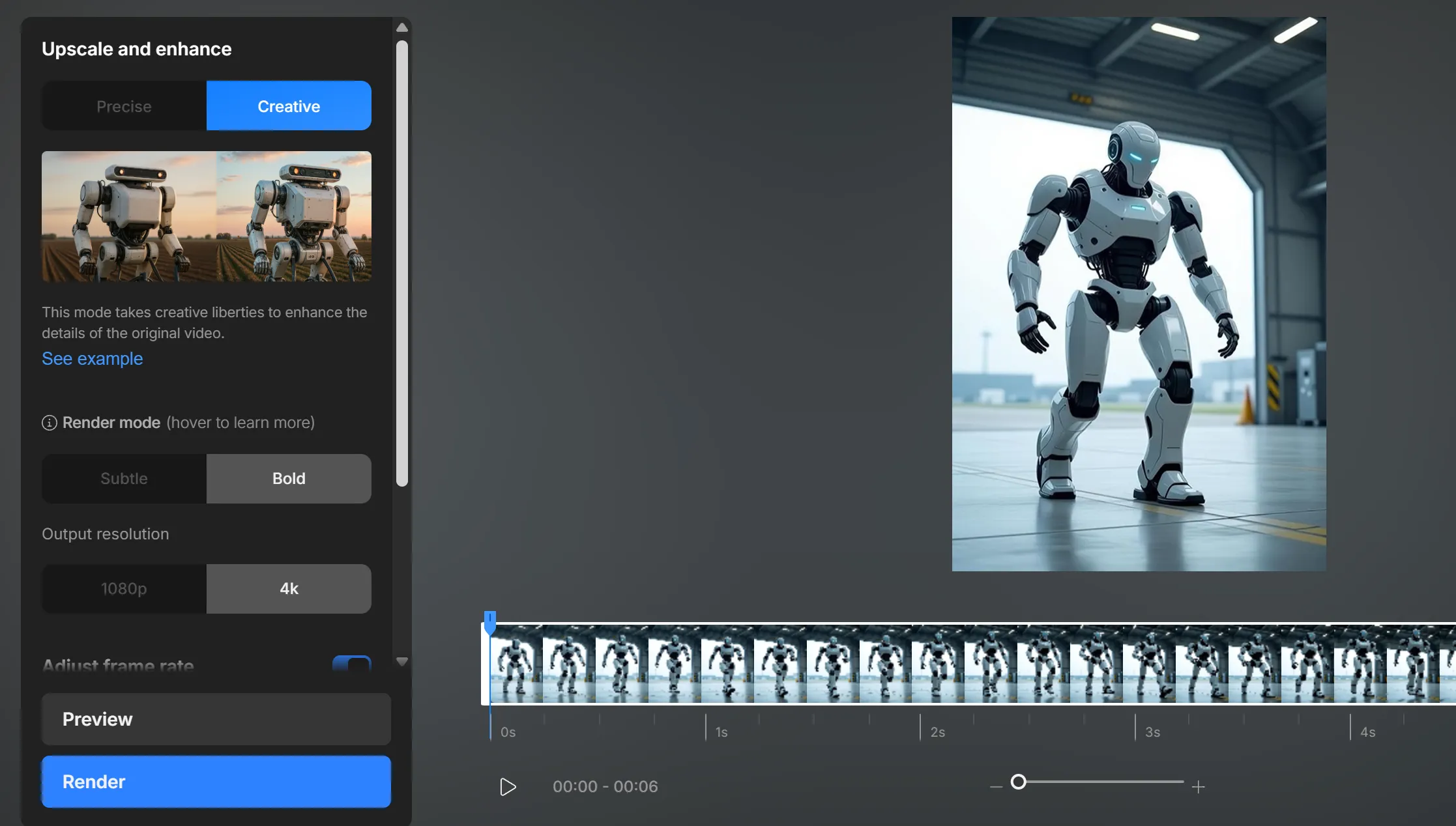 With multiple creativity settings, you're in complete control. Choose a precise upscale that honors the original, or inject new life by allowing our AI to creatively reimagine the details in your footage.