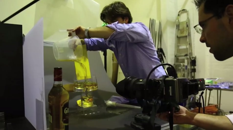 With the very creative liquid photography there is often a need to create a bespoke set up for the shoot. For Grant’s we had to make a device that made the glasses look like they were floating in mid-air, above each other, but then be able to remove the glasses away and clean them after every shot. You can see this in the behind the scenes video. And yes, we really did use real whisky for these splashes, 20 bottles in all!