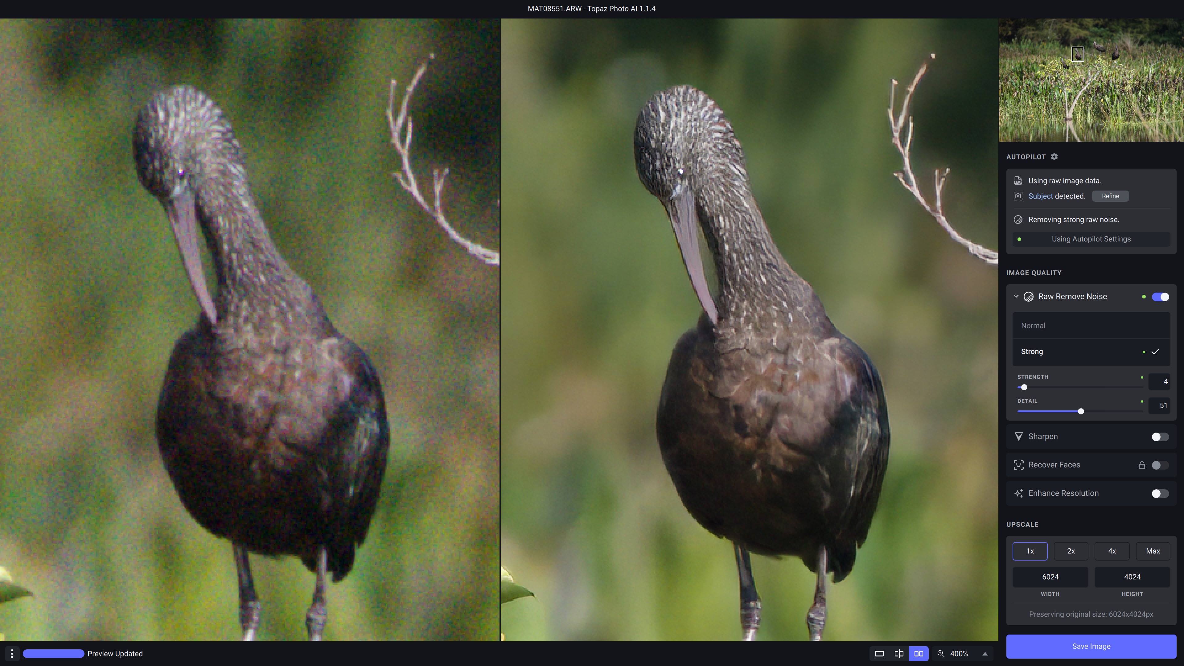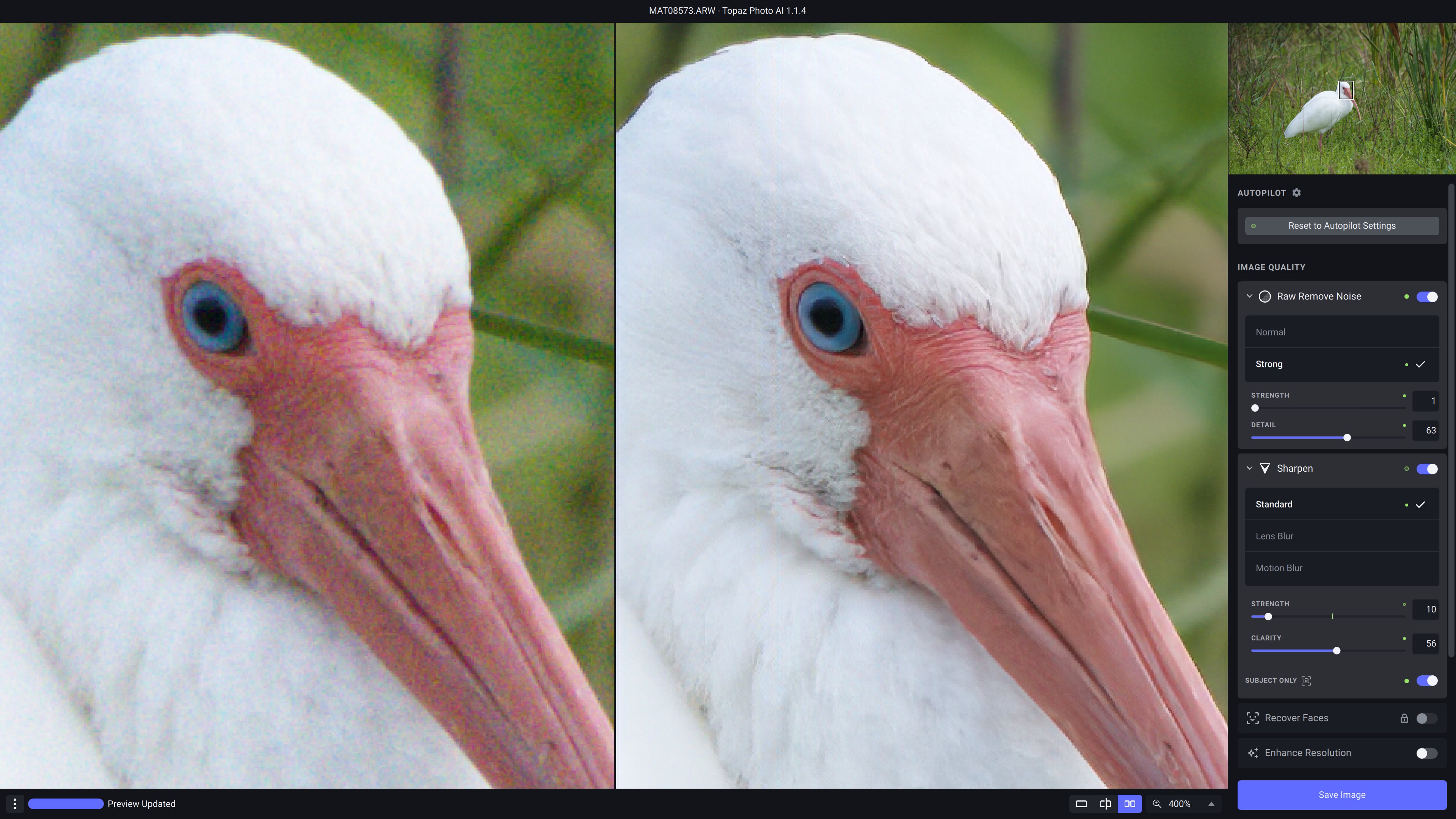 The RAW Strong noise reduction model both cleans up excessively noisy RAW photos and improve details throughout. However, when it was introduced in Topaz Photo AI v1.1, the the RAW Strong noise reduction model could only be applied when a user manually selected it. Autopilot also used an older estimation method to recommend optimal Strength and Detail parameters for that model.