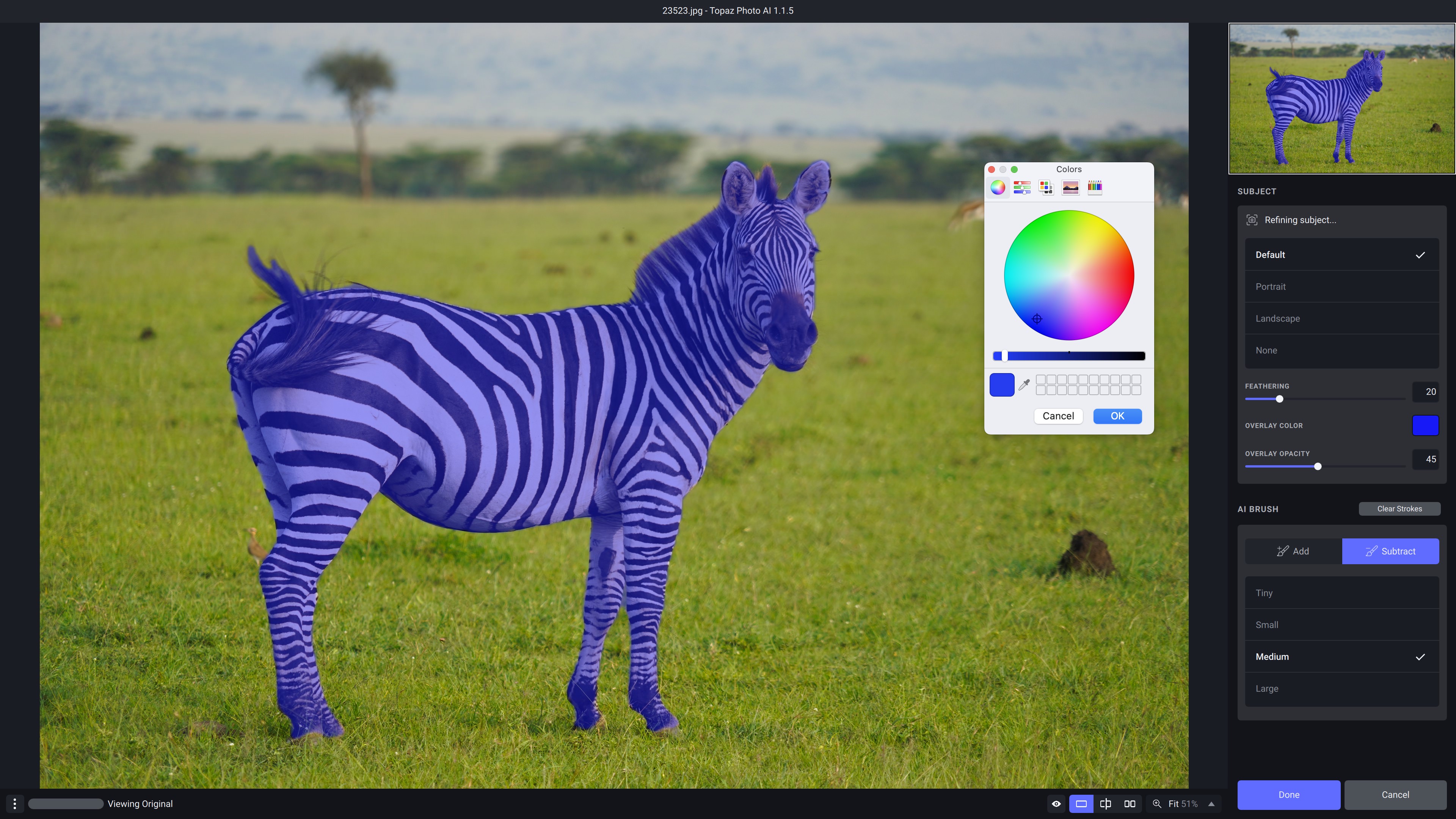 Previously, when Topaz Photo AI automatically detected a subject, it would apply a red mask which could be refined using the AI Brush. To make masking customizable and more accessible for users who have difficulty seeing red, we have added a color picker, allowing you to choose another overlay color that is easier to discern. We’ve also added an Overlay Opacity slider, which will adjust the strength of the overlay color. You can access these controls by clicking on the Refine button next to “Subject detected” in Autopilot.