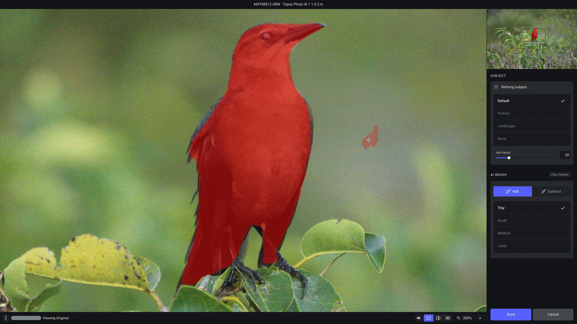 Refining subject masks is now more accurate, allowing you to fine-tune exactly where sharpening will be applied. When using the AI Brush, you will now be able to control the brush size by selecting one of four options: Tiny, Small, Medium, and Large. You can also use the [ and ] keyboard shortcuts to toggle between  brush sizes.