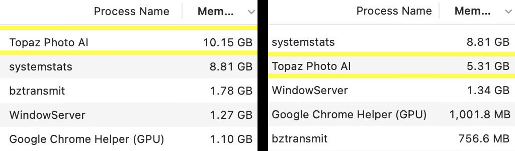Peak memory usage improvements: Topaz Photo AI v1.0.6 (left) and v1.1 (right)