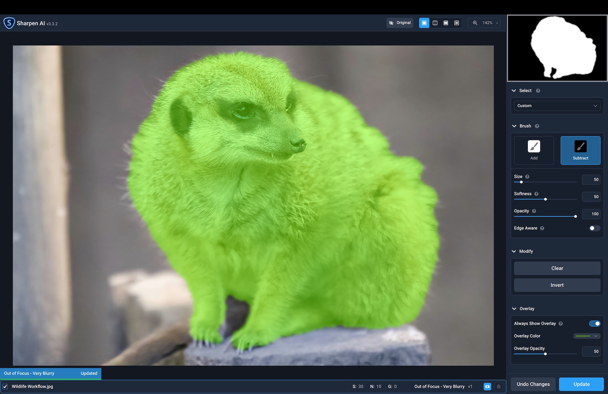 Once I mitigated the noise in the photo, I was free to apply some color and tone corrections, including adjusting exposure and setting a correct white balance. I also opted to crop the photo so that the meerkat filled the bulk of the frame. The next step in my workflow involved using Sharpen AI to apply targeted sharpening, especially around the meerkat’s head, since that is where the primary focus was established. Fortunately, Sharpen AI’s new Auto Subject detection made it very easy to quickly isolate exactly where sharpening should be applied.